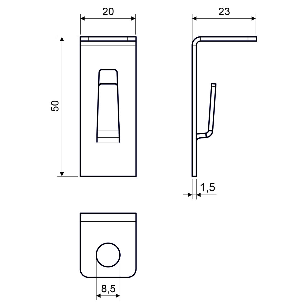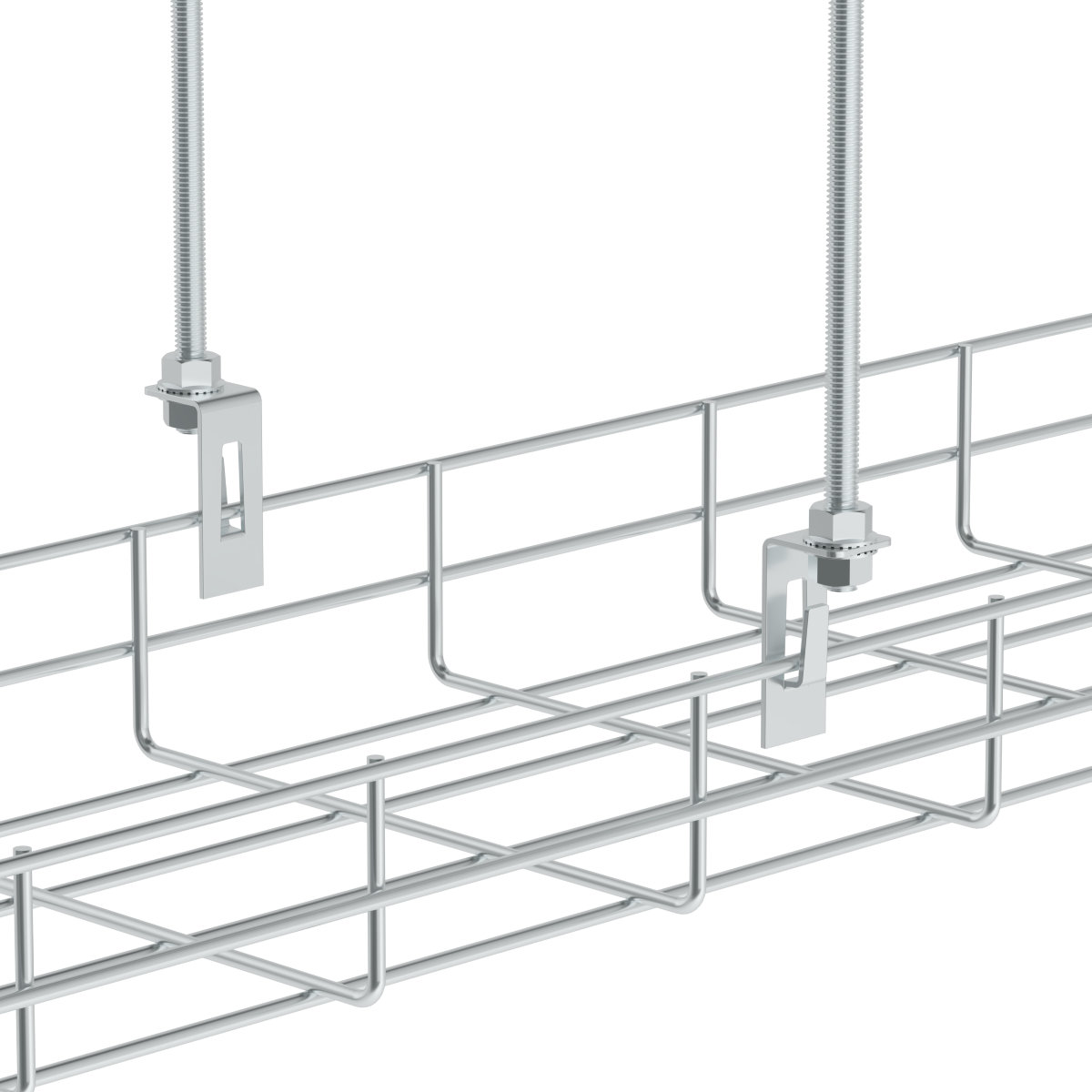 The side hanger is designed for hanging a wire cable tray from the ceiling using a threaded rod Ø 8 mm and two ML 8 nuts. The hanger is always used in pairs, the wire tray must be suspended on both sides. The max. recomended load for one mounting point (2 pcs. DZBZ) is 15 kg.